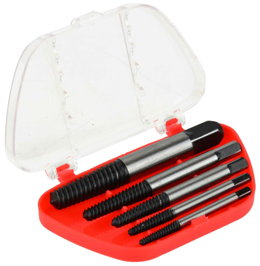 Sada piatich skrutkových extraktorov rôznych veľkostí určených na odstránenie zlomených alebo inak poškodených skrutiek, kolíkov atď.