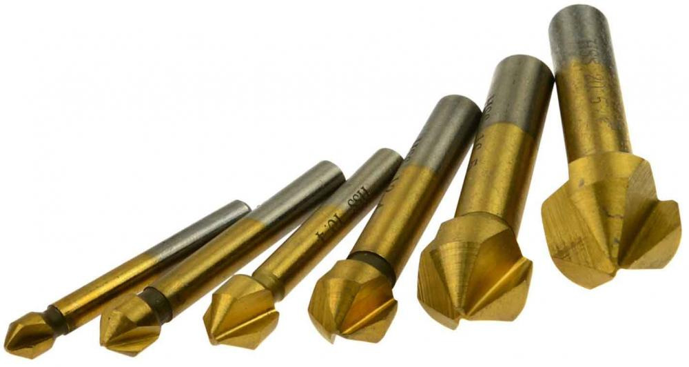 Sada záhlbníkov do kovu . Sada obsahuje šesť záhlbníkov s priemerom 6,3-20,5 mm. Sú vyrobené z vysoko kvalitnej rýchloreznej ocele HSS TiN.