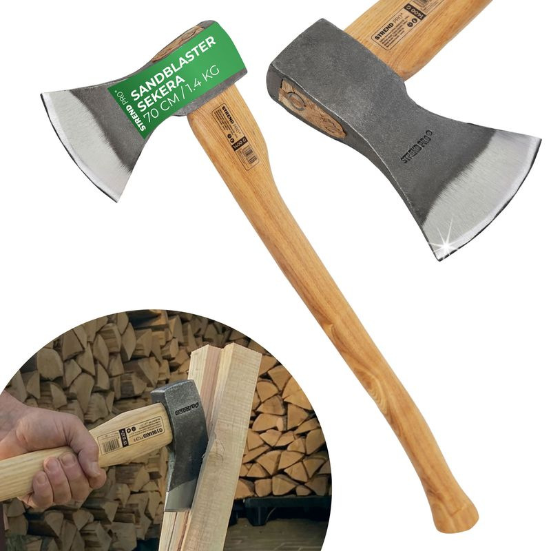 Sekera na rúbanie dreva Strend Pro Sandblaster s drevenou lakovanou rukoväťou. Hlava sekery je pieskovaná a lakovaná.