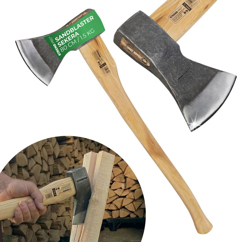 Sekera na rúbanie dreva Strend Pro Sandblaster s drevenou lakovanou rukoväťou. Hlava sekery je pieskovaná a lakovaná.