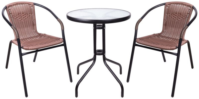 Set je skvelým doplnkom na balkóny alebo terasy, pre príjemné posedenie. Set pozostáva z dvoch stoličiek a stola. Konštrukcie stoličiek sú kvôli pevnosti a stabilite vyrobené z kovu s priemerom 25 x 1 mm. Zvyšný povrch stoličiek je pokrytý hnedým, polyratanovým povrchom, ktorý pôsobí veľmi prírodne. Rozmery jednej stoličky sú 55 x 50 x 70 cm a nosnosť je 120 kg. Konštrukcia stola je taktiež vyrobená z kovu s priemerom 22 x 1 mm. Vrchná časť stola je vyrobená z tvrdeného skla, hrubého 5 mm. Celkový rozmer stola je 60 x 70 mm. Set je veľmi nenáročný na údržbu, stačí ho jednoducho pretrieť vlhkou handričkou, čím odstránite prípadnú nečistotu.