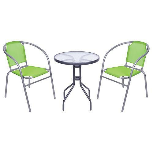 Balkónový set pozostáva z dvoch stoličiek a jedného okrúhleho stola. Set je ideálnym funkčným doplnkom pre posedenie, počas teplých letných dní. Hlavné konštrukcie nábytkov sú vyrobené z kovu. Povrch stoličiek je pokrytý pevnou sieťovinou zelenej farby. Povrch stola je zasa vyrobený z tvrdeného skla. Rozmery jednej stoličky sú 60 x 71 cm a rozmery stola sú 72 x 59 cm. Set je potrebné umiestniť na rovný povrch.