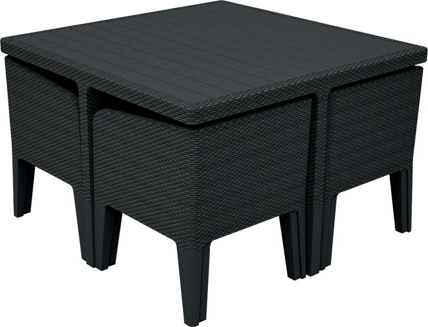 Terasový set má moderné a elegantné prevedenie, inšpirované prírodným ratanom. Set je výnimočný modulárnou konštrukciou, ktorá umožňuje umiestniť stoličky pod stôl. Stoličky majú hlboké sedáky a mäkké polstrovanie, čo zaisťuje maximálny komfort. Celý set je vyrobený z materiálu, ktorý je odolný voči UV žiareniu a poveternostným podmienkam. Údržba setu je preto veľmi jednoduchá. Povrch nábytkov je v grafitovej farbe.