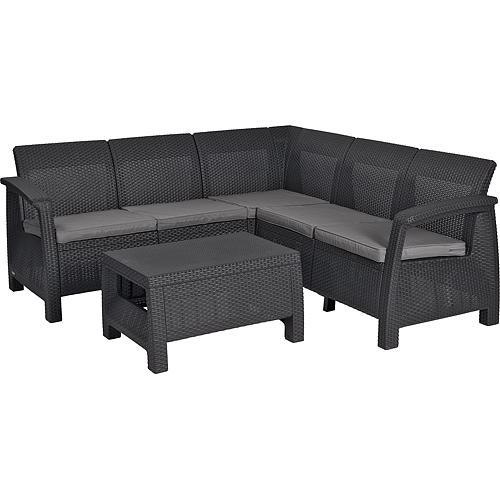 Terasový set je štýlovým a praktickým doplnkom na každú terasu či záhradu. Set tvorí stôl a rohová pohovka. Pohovka poskytuje priestor je usadenie piatich ľudí. Povrch nábytkov je vyrobený z polypropylénu, ktorý je modernejšou náhradou ratanu. Výhodou tohto materiálu je jeho vysoká odolnosť voči UV žiareniu a poveternostným podmienkam. Vďaka tomu je možné dlhodobo skladovať nábytok vo vonkajších priestoroch, nehrozí jeho poškodenie od slnka alebo dažďa. Celý set pôsobí atraktívnym moderným dizajnom a je v grafitovej farbe. Montáž setu je veľmi jednoduchá, nie je potreba použitia špeciálneho náradia. Rozmery stola sú 80 x 60 x 40 cm a rozmery pohovky sú 182 x 182 x 80 cm. Súčasťou setu sú podušky na sedenie v sivej farbe.