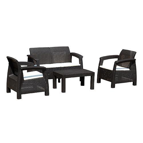 Set kresiel a stola je určený pre využitie najmä na terasách. Je vyrobený z odolného polypropylénu, ktorý je veľmi podobný ratanu. Poskytuje odolnosť voči UV žiareniu a poškodeniu pred poveternostnými podmienkami. Je krásnej tmavej farby a má atraktívny moderný dizajn. Montáž setu je veľmi jednoduchá, nebudete na ňu potrebovať žiadne špeciálne náradie. Balenie pozostáva zo stola, dvoch 1-miestnych kresiel a jedného 2-miestneho kresla. Rozmery 2-miestnej pohovky sú 120 x 70 x 80 cm, rozmery 1-miestnych kresiel sú 65 x 70 x 80 cm a rozmery stola sú 80 x 60 x 40 cm. Súčasťou balenia sú tiež podsedáky ku kreslám, v krásnej béžovej farbe, ktorými bude sedenie na terase ešte príjemnejšie a pohodlnejšie.