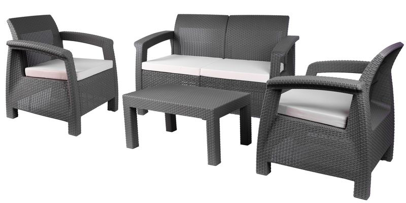 Terasový set je ideálnym a štýlovým doplnkom pre letné posedenia. Set pozostáva z jedného stola a dvoch kresiel a dvojmiestnej pohovky. Celý set je vyrobený z odolného, polypropylénového materiálu, ktorý pôsobí ako imitácia ratanu. Výhoda tohto materiálu je nie len vo vzhľade, keďže pôsobí naozaj moderne, ale hlavne v jeho odolnosti voči UV žiareniu a poveternostným podmienkam. Z tohto dôvodu si nábytok nevyžaduje špeciálne ošetrenia. Farba nábytku je tmavohnedá, čo perfektne ladí s mocca hnedými podsedákmi, ktoré sú taktiež súčasťou balenia. Podsedáky poskytujú čo najpohodlnejšie sedenie. Rozmery kresla sú 65 x 70 x 80 cm, rozmery stola sú 80 x 60 x 40 cm a rozmery pohovky sú 120 x 70 x 80 cm.