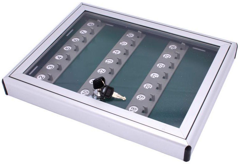 Hliníková skrinka pre 24 kľúčov. Rozmery 40 x 295 x 370 mm.