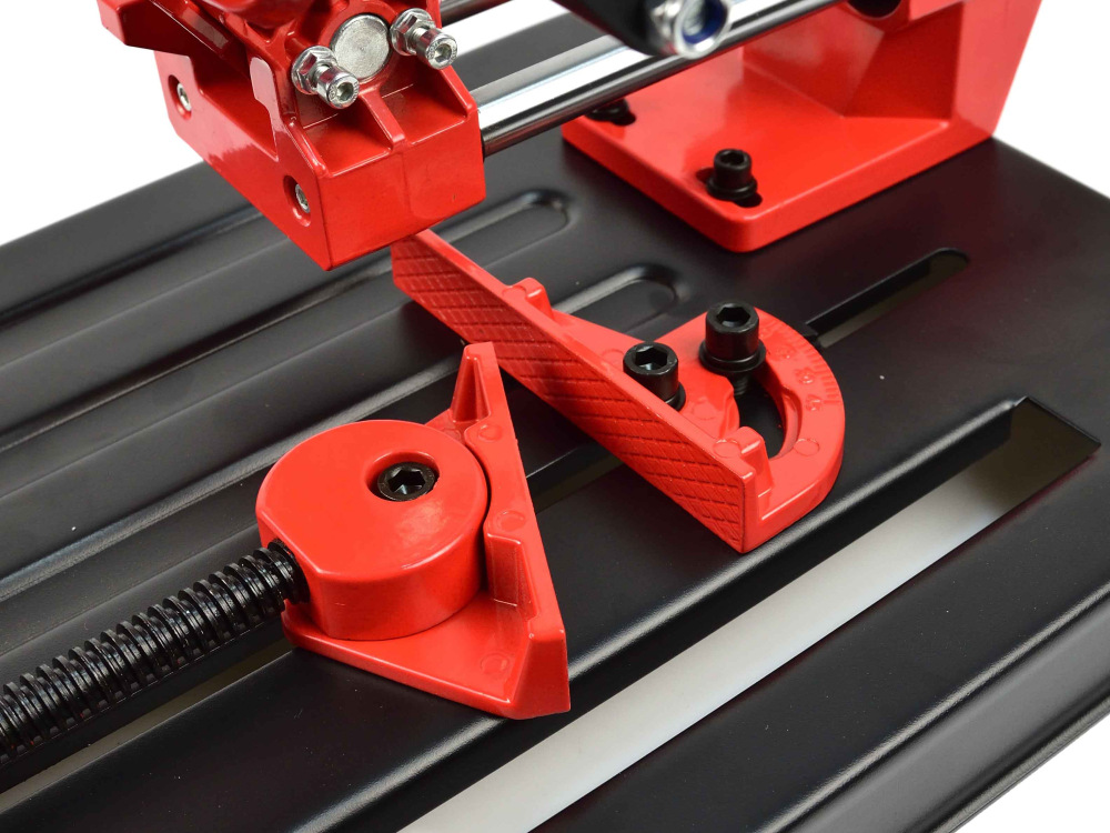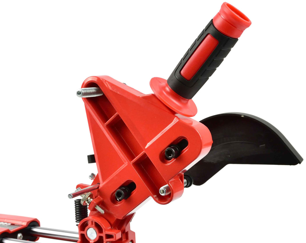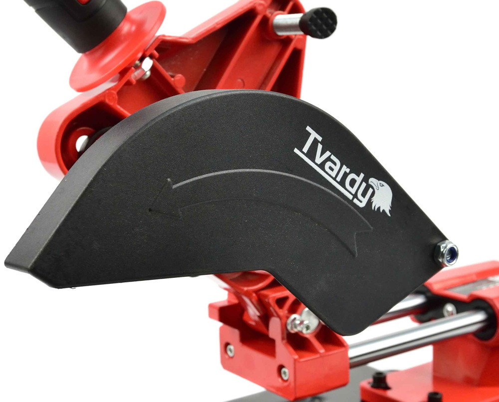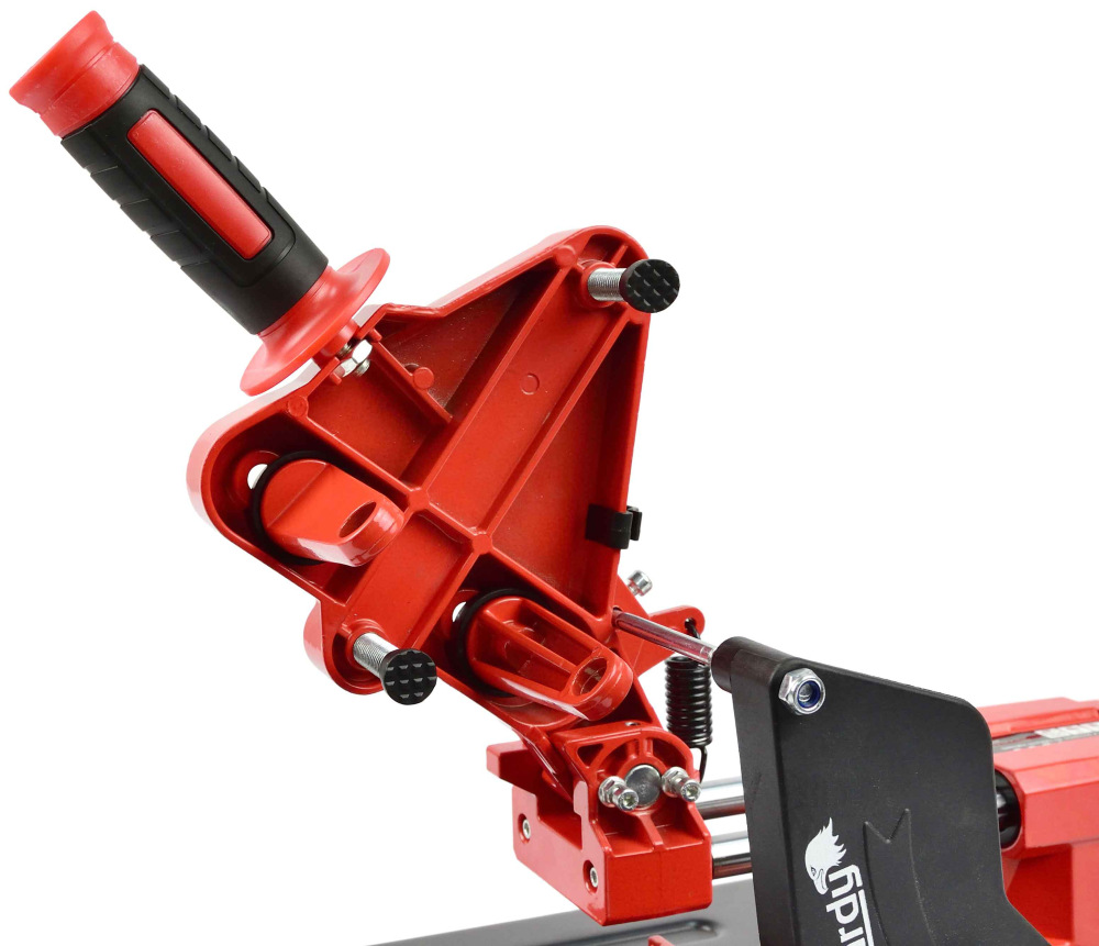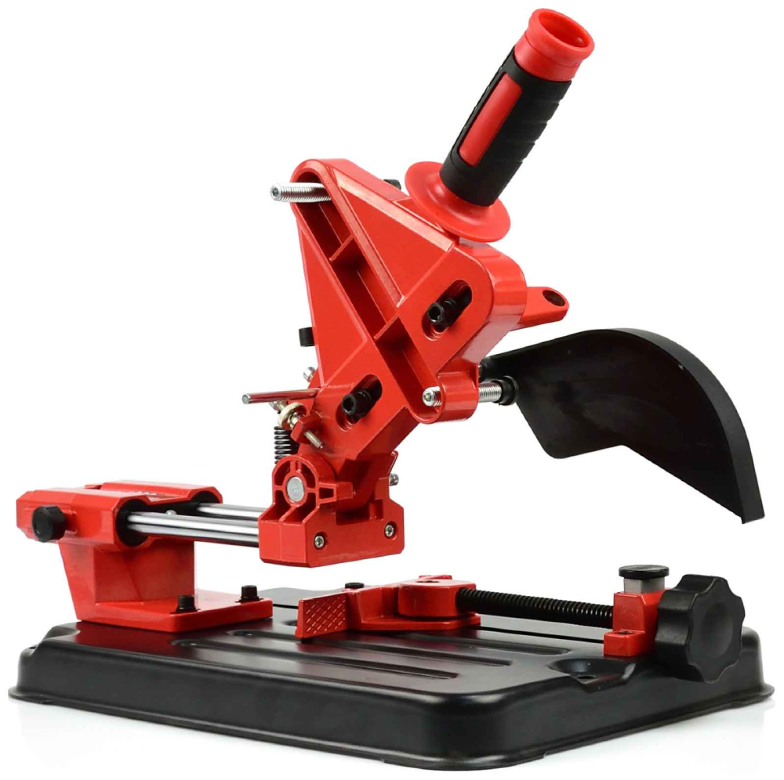 Presný stojan určený pre použitie s uhlovými brúskami s priemerom kotúča 115-125 mm. Telo statívu vyrobené z kvalitného hliníka zaručuje stabilný chod a presné rezanie. Pevné oceľové vodidlá umožňujú presné rezanie s dĺžkou 130 mm. Nastaviteľná upínacia svorka umožňuje rezať pod uhlom 0°-45°, rozstup čeľustí upínacej svorky umožňuje upnutie materiálu do šírky 150 mm.
