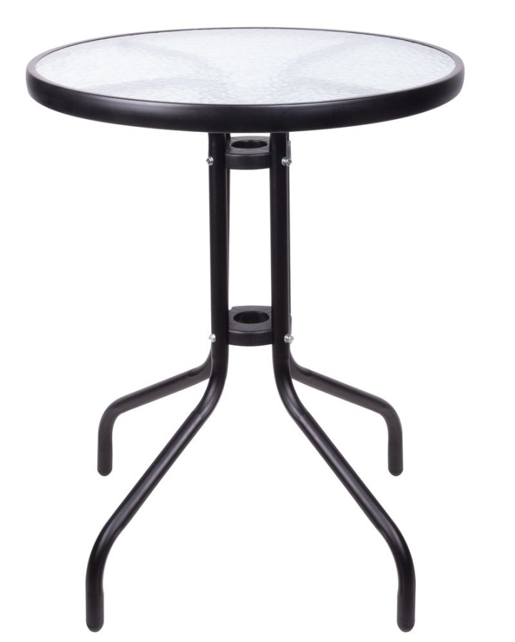 Stôl je vhodný pre umiestnenie na balkóny alebo terasy. Je menších rozmerov, čím nezaberá veľa miesta. Spodná časť stola je vyrobená z kovu s rozmermi 22 x 1 mm. Vrchná plocha je pokrytá priehľadným tvrdeným sklom, s hrúbkou 5 mm. Celý stôl je v odtieňoch hnedej farby. Výška stola je 70 cm a priemer užívateľskej plochy je 60 cm. Stôl nevyžaduje špeciálne ošetrenie. Je vhodné ho umiestniť na rovný a tvrdší povrch.