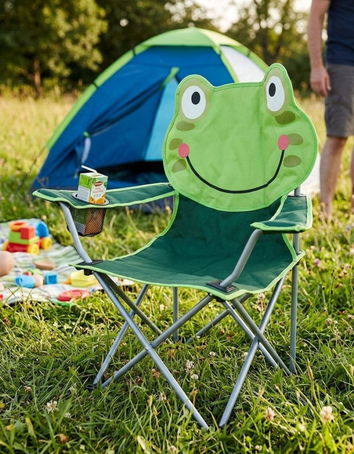 Detská stolička je malá, praktická, prenosná pomôcka. Vďaka stoličke môžete deti usadiť kdekoľvek, čím predídete napríklad sedeniu na zemi v prírode. Stolička je zelenej farby, s motívom žaby v časti chrbta. V opierke na lakeť je miesto určené pre umiestnenie nápoja. Konštrukcia je vyrobená z kovu s priemerom 13 x 0,7 mm, čím poskytuje pevnosť a nosnosť 60 kg. Rozmery sú 35 x 35 x 55 cm.