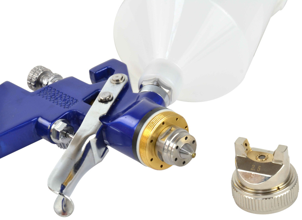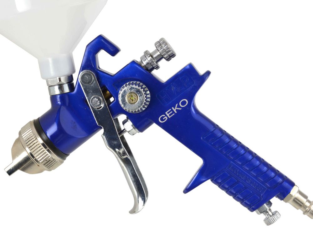 Profesionálna striekacia pištoľ HVLP. Vyrobené z najkvalitnejších materiálov. Pištoľ je poháňaná stlačeným vzduchom. Vzduch z kompresora sa dostáva do nádrže na farbu a do trysky pištole. Výsledný tlak "vytlačí" kvapalinu z nádrže a nastriekané častice farby sú vrhané cez trysku na lakovaný povrch.