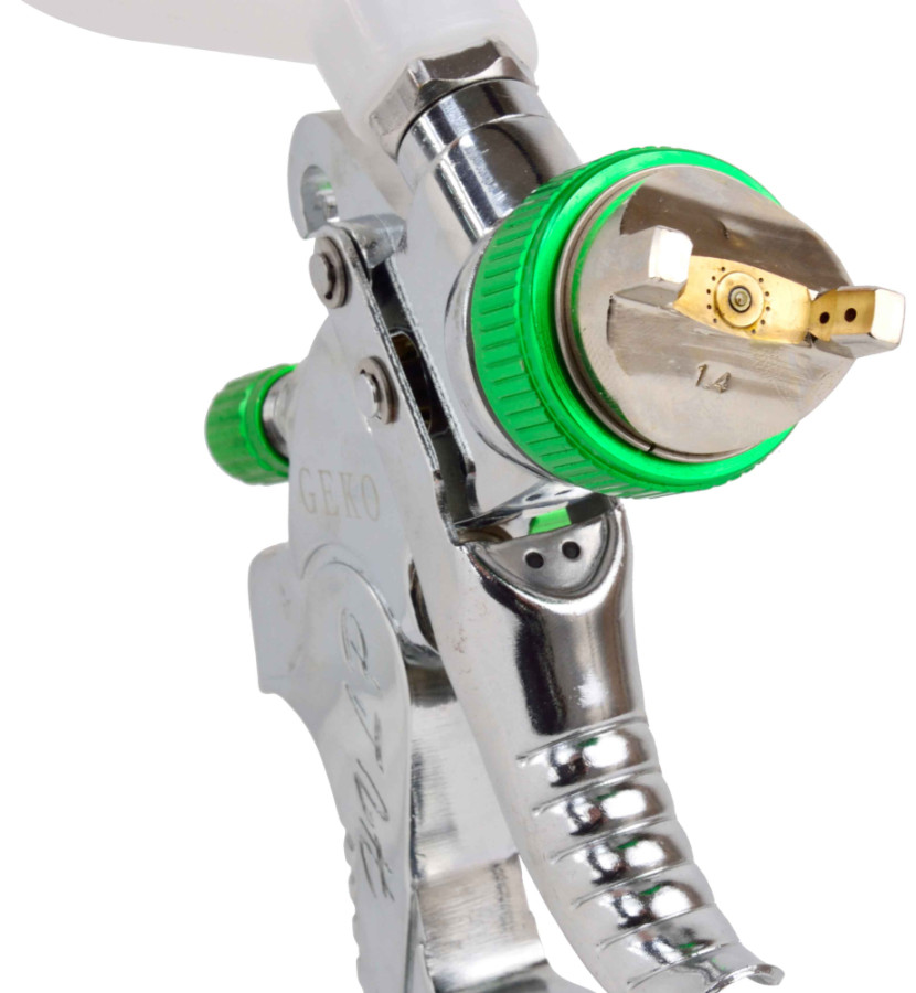 Profesionálna nízkotlaková lakovacia pištoľ Dragon HVLP GEKO . Vyrobené z najkvalitnejších materiálov. Pištoľ je poháňaná stlačeným vzduchom . Vzduch z kompresora sa dostáva do nádrže na farbu a do trysky pištole. Výsledný tlak "vytlačí" kvapalinu z nádrže a nastriekané častice farby sú vrhané cez trysku na lakovaný povrch.
