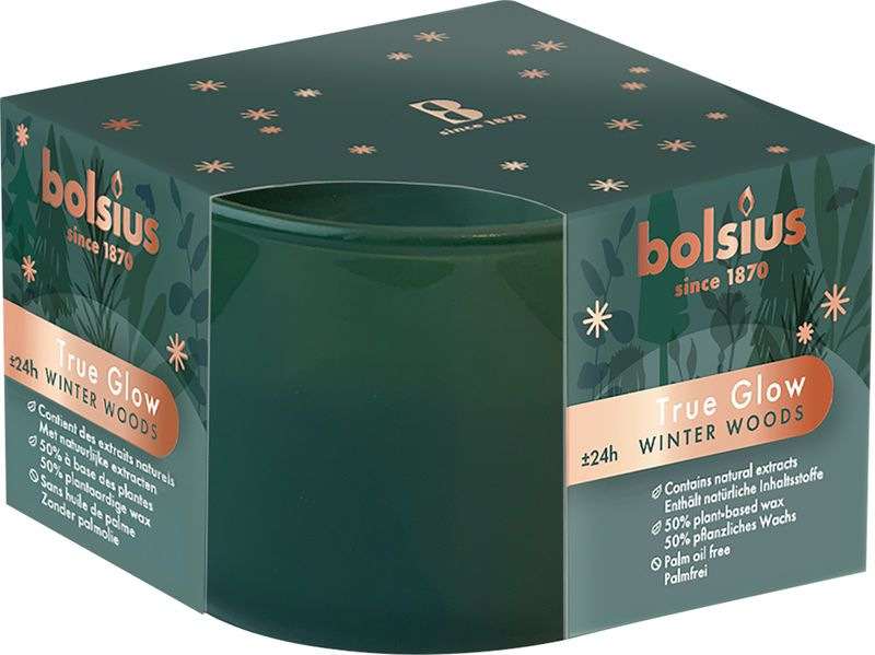 Sviečka Bolsius True Glow, Vianočná, v skle, rastlinný vosk, vôňa zimnej dreviny, 24 hod., 63x90 mm