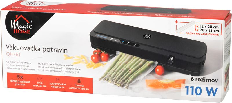 Zachovajte čerstvosť potravín na dlhší čas s modernou vákuovačkou MagicHome. Tento výkonný a kompaktný prístroj je ideálny pomocník do každej domácnosti, ktorý spoľahlivo odstráni vzduch z vreciek a bezpečne ich utesní. Pomáha tak predĺžiť trvanlivosť potravín, uchovať ich chuť, vôňu aj výživové hodnoty.