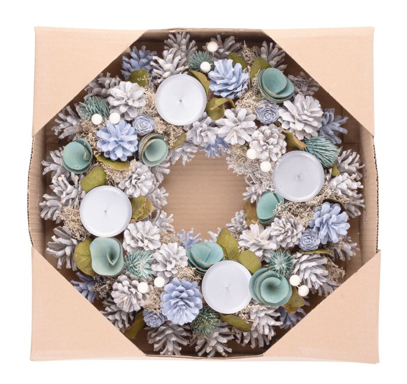 Veniec MagicHome by nemal chýbať vo výbave vášho interiéru počas vianočných sviatkov. Je to vkusný prírodný, adventný veniec so sivými hrotmi na sviečky. Farba je modrá. Jeho priemer je 38 cm.