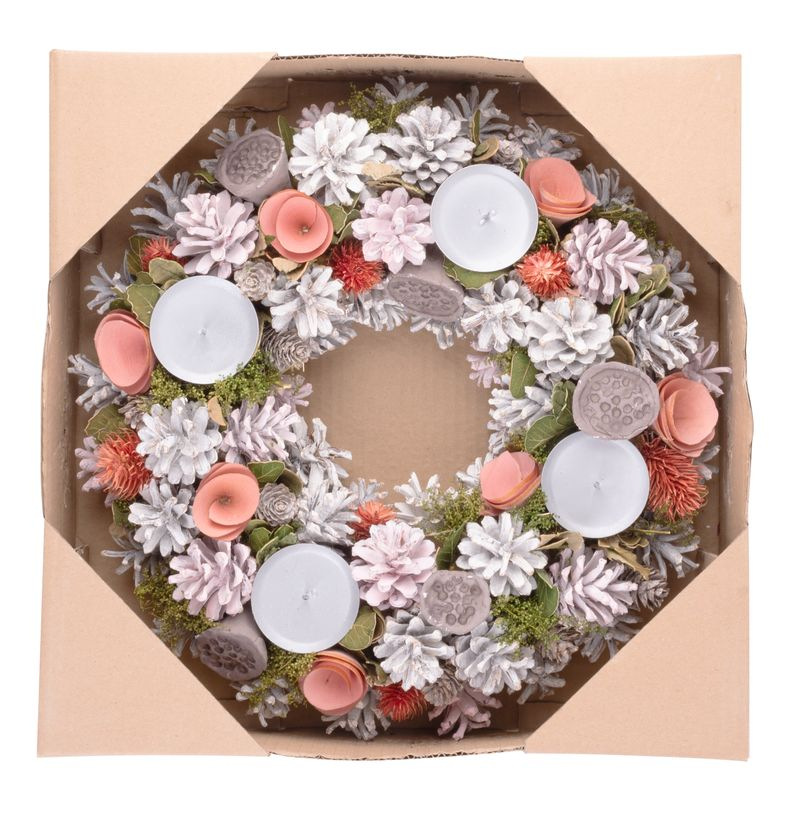Veniec MagicHome by nemal chýbať vo výbave vášho interiéru počas vianočných sviatkov. Je to vkusný prírodný, adventný veniec so sivými hrotmi na sviečky. Farba je ružová. Priemer je 38 cm.