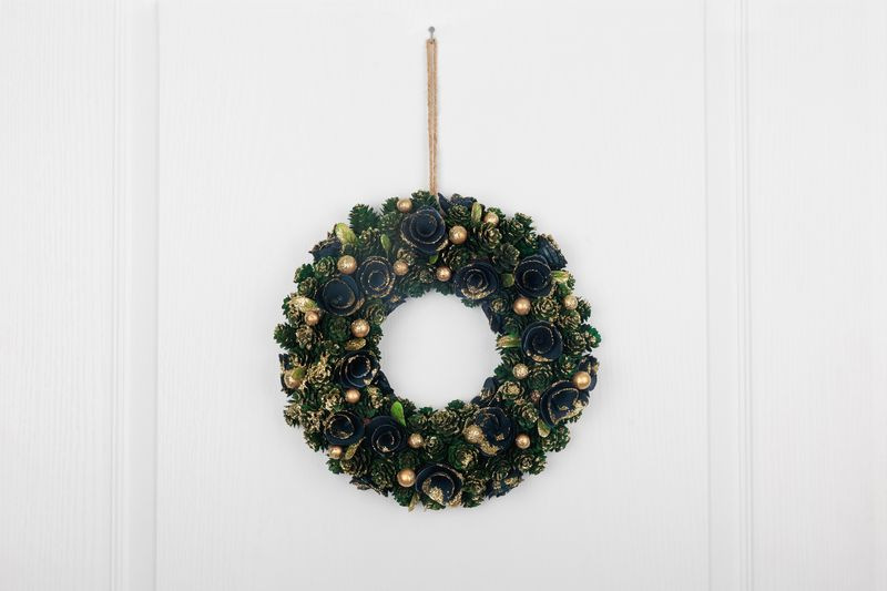 Dizajnový vianočný veniec MagicHome prinesie do vášho domova nádych elegancie a sviatočnej atmosféry. Veniec je zdobený prírodnými šiškami, dekoratívnymi kvetmi a ozdobnými guľôčkami v zeleno-modro-zlatých tónoch, ktoré vytvárajú moderný a pritom teplý vzhľad.
