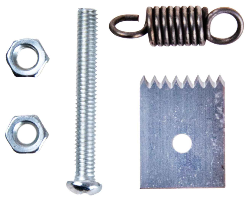 Sada obsahuje: pásku s páskou a sponkami, náhradnú skrutku, matice, pružinu a čepeľ